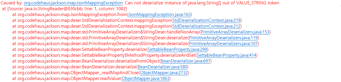 원인은 프론트 자바스크립트에서 배열로 전달해야했으나 단순 String으로 전달하여 자바vo에서 선언한 배열변수와 타입이 안맞아서 발생한 에러.